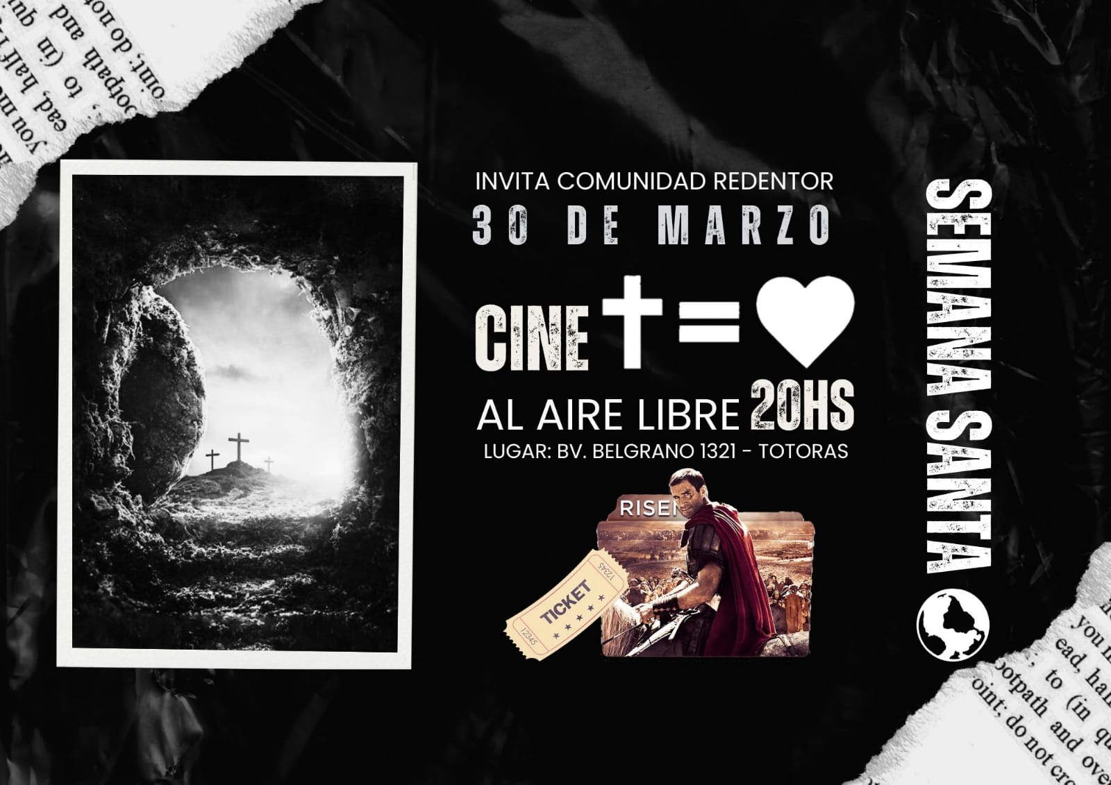 Este sábado 30 de marzo desde las 20 hs, Redentor de Totoras invita a la comunidad a ver la película Risen con cine al aire libre en Bv. Belgrano 1321.